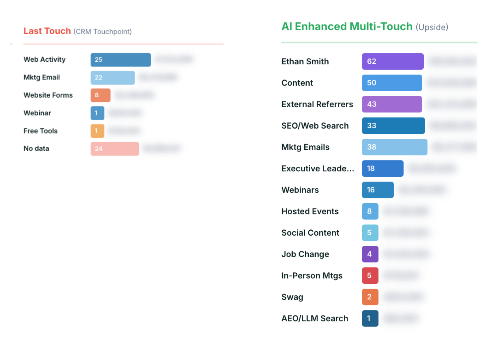 When Graphite first started working with Upside, the initial attribution reports painted a misleading picture. Traditional last-touch and first-touch models showed only three things driving revenue: web activity, marketing email, and website forms. A significant number of deals appeared to have no attribution data at all.
