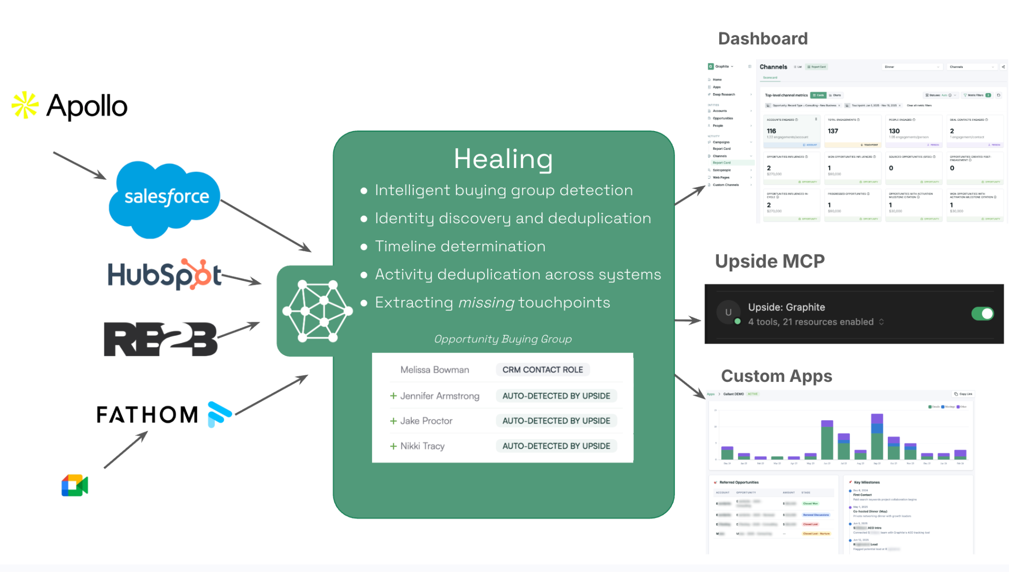 Upside connected all of Graphite's data sources — Salesforce, HubSpot, Apollo, Fathom call transcripts, RB2B anonymous traffic data — into a unified knowledge graph. Rather than relying on simple first-touch or last-touch credit, Upside used AI to extract missing touchpoints from call transcripts and emails, perform intelligent buying group detection, and recover persona identifications that weren't properly tracked in the CRM.