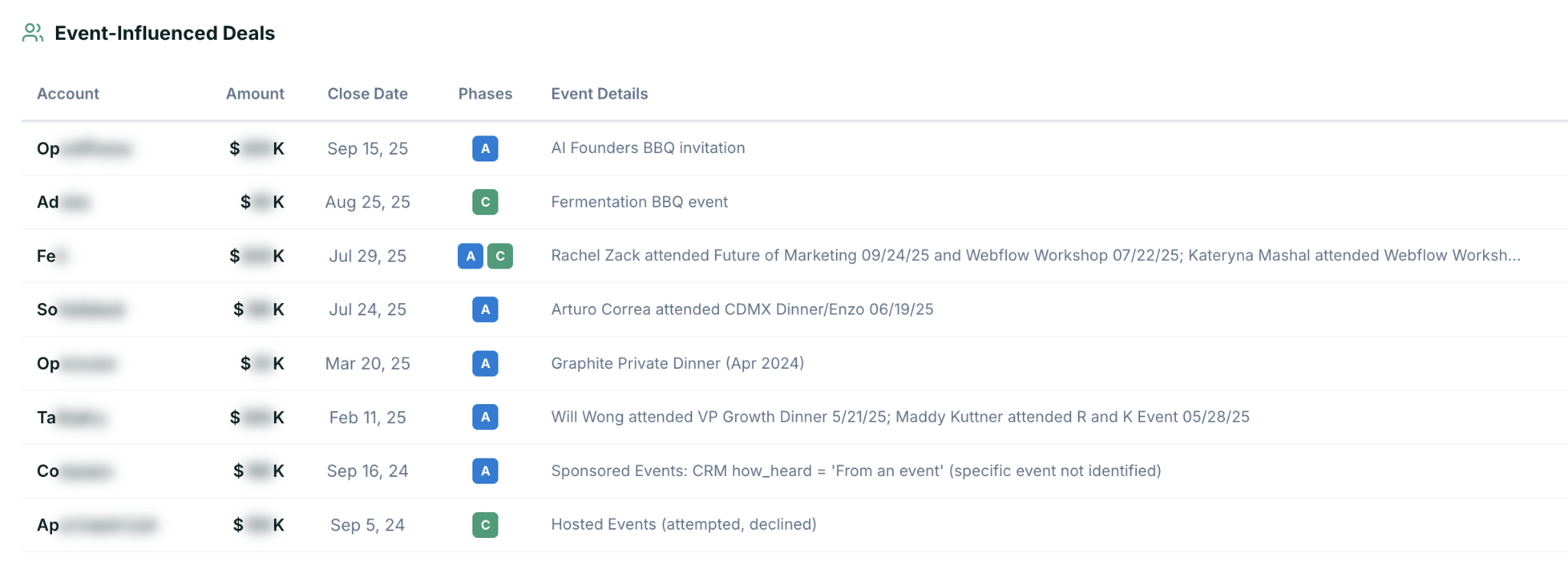 Upside also revealed that events help Graphite build champions — people who become long-term advocates. When those champions change jobs, they bring Graphite with them (accounting for 4 additional deals). Events create a compounding flywheel of referrals and champion-building that is invisible to any single-touch attribution model.
