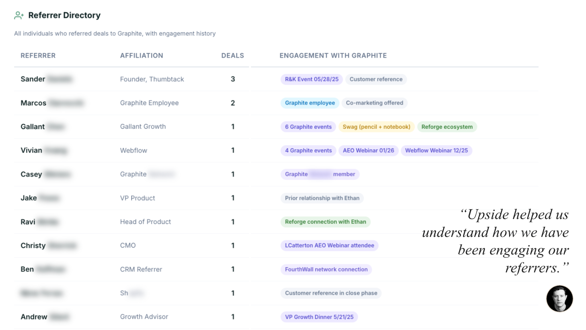"We had no idea how many people were referring deals to us. Upside looked at all of the data and showed us the full picture." — Ethan Smith, CEO & Founder, Graphite